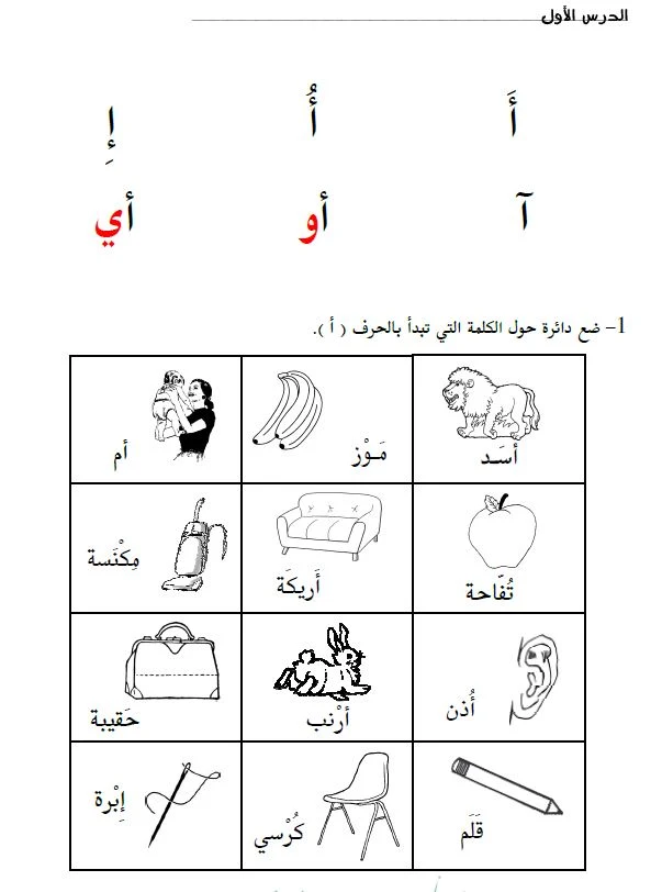 Letter recognition activity: Choose pictures/words that start with the target letter (example: أرنب with أ)