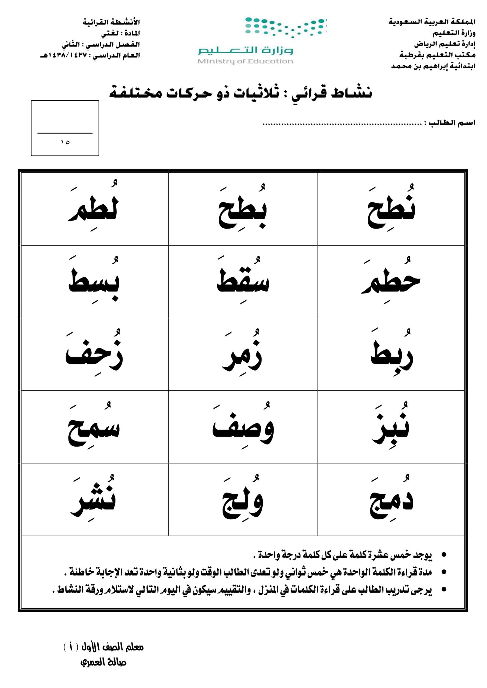 Short Vowel Words Activity Worksheet PDF Free Download For Grade 1, Second Semester Prepared by: Teacher Saleh Al-Omari. Features of the